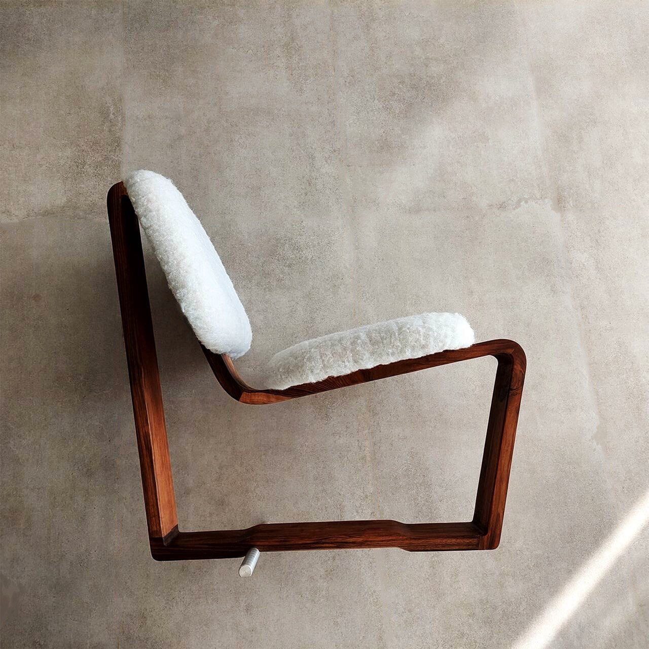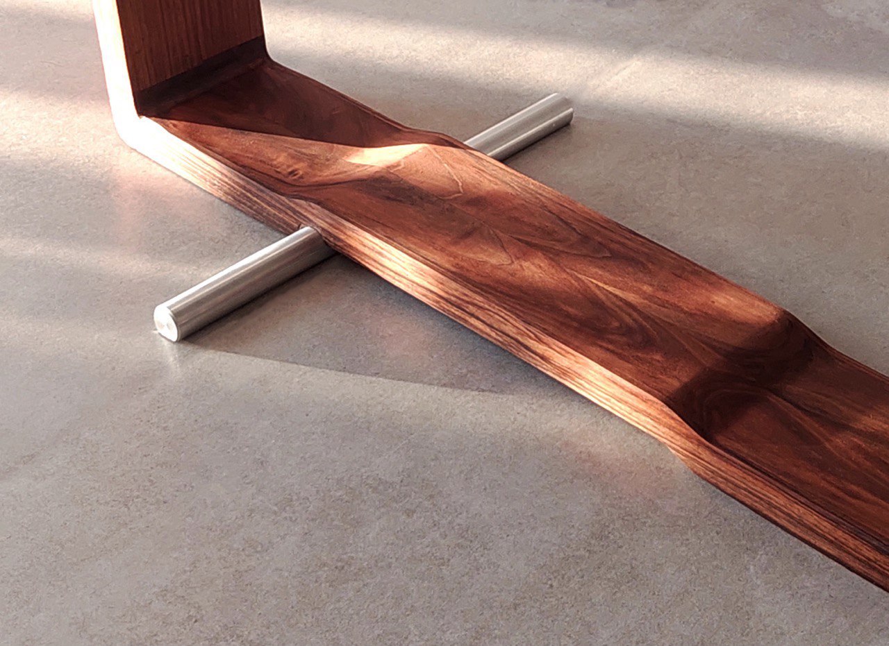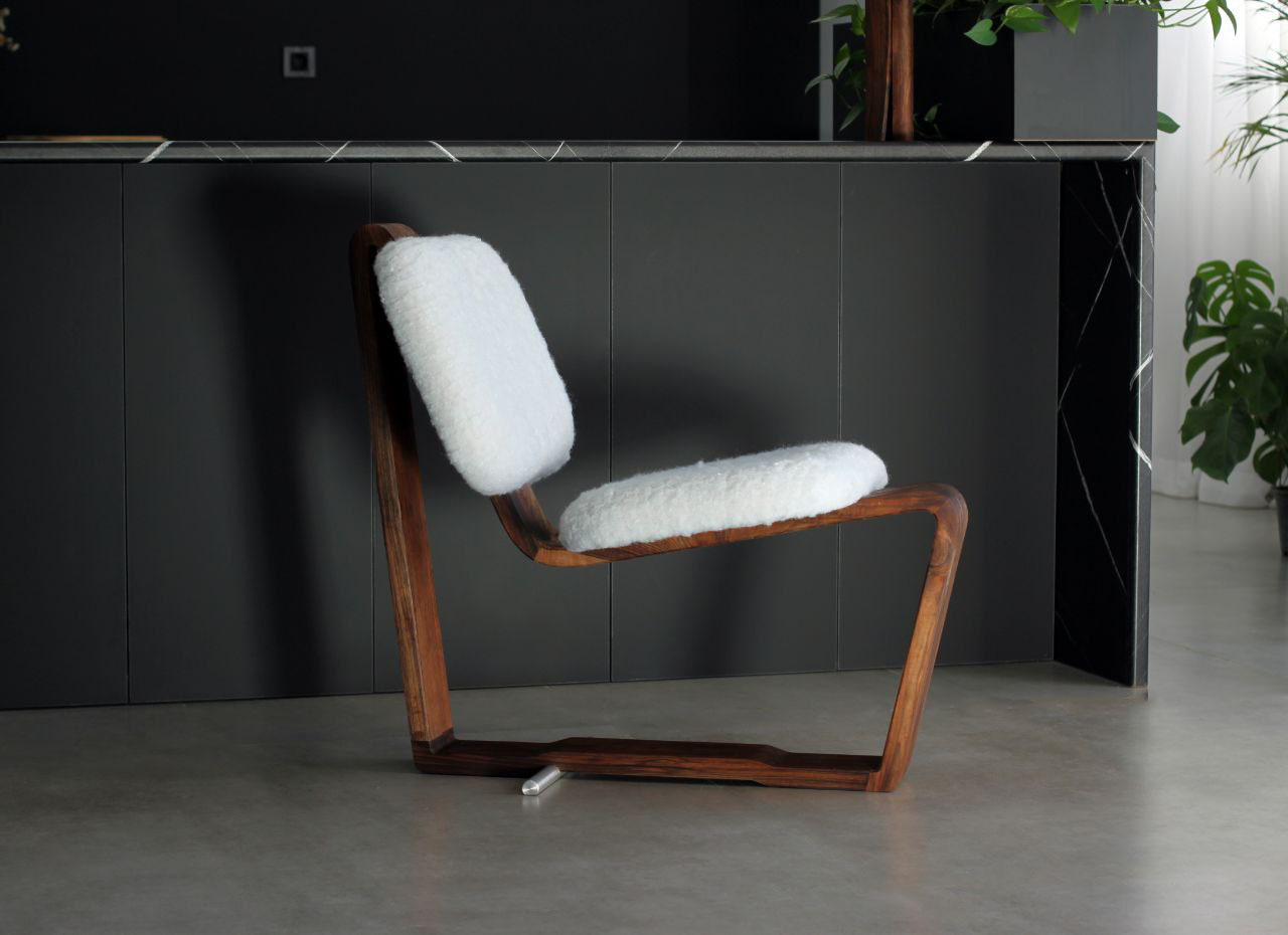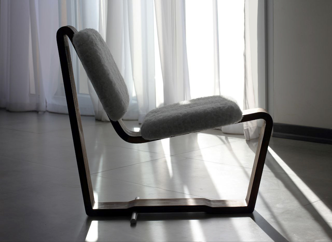 In the design of this chair, a mature response to the need for seating has been provided. The three-centimeter walnut frame moves fluidly and softly, seeking to honor the body's form and align with it. This smooth motion of the frame, when needed, creates a gap through which a three-centimeter aluminum rod passes, serving as a support. The interaction between wood and metal, like a precise symbiosis, creates balance and comfort. This chair is not just a tool for sitting, but each curve and line tells a story of balance and harmony.