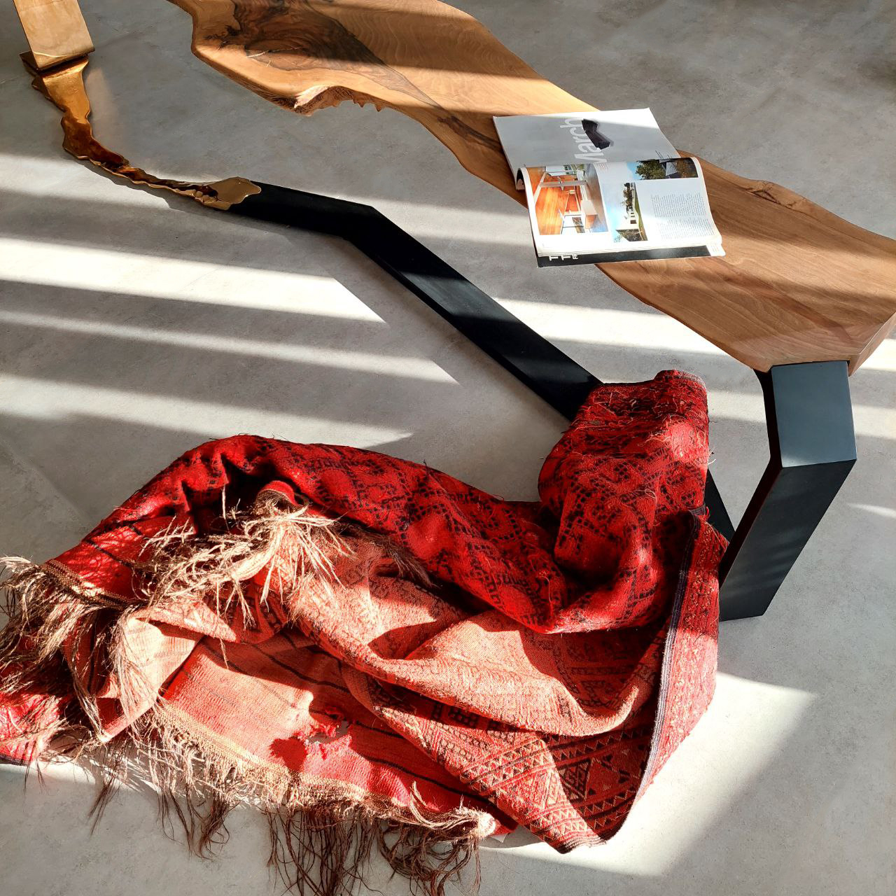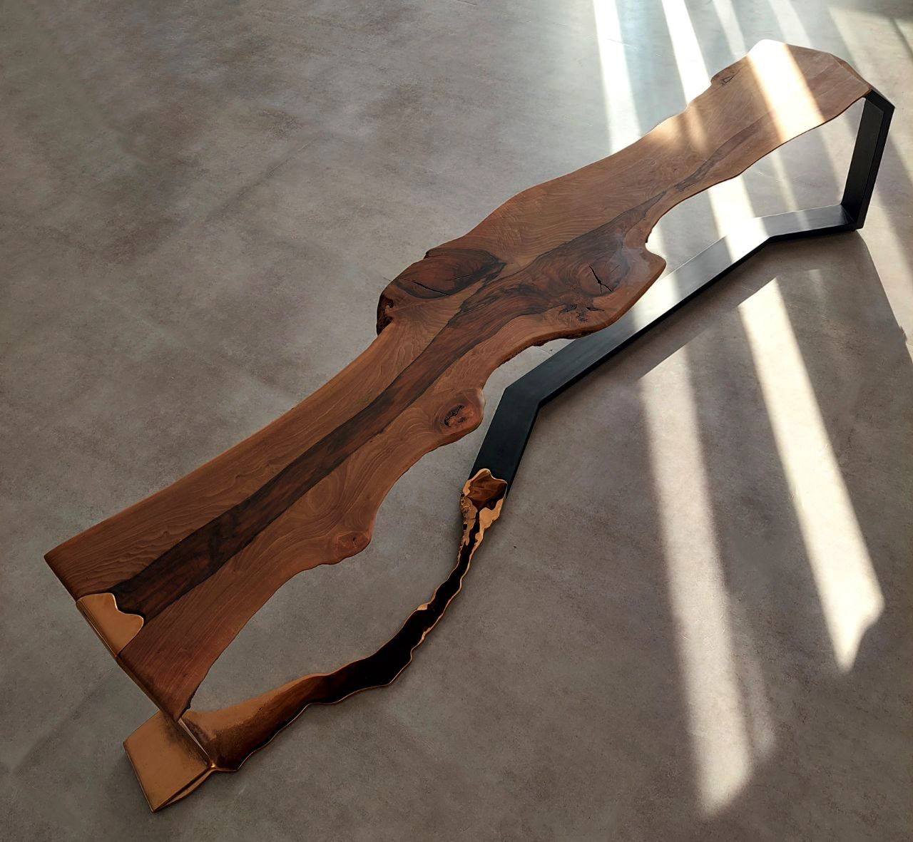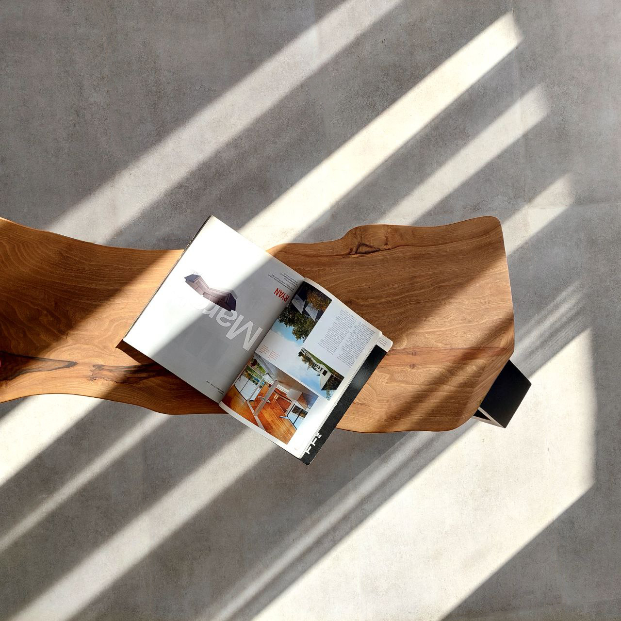 The "Siah Rud" (Means: Black River) bench is made from the wood of a tree aged 350 to 400 years. This tree, located by a river named Siah Rud, has witnessed the passage of water and time for years. The design of the bench is inspired by this continuous flow, with its fluid form cascading down like a waterfall, transitioning into a geometric and modern structure. The balance between functionality and form was designed and crafted for an art exhibition in 2020.